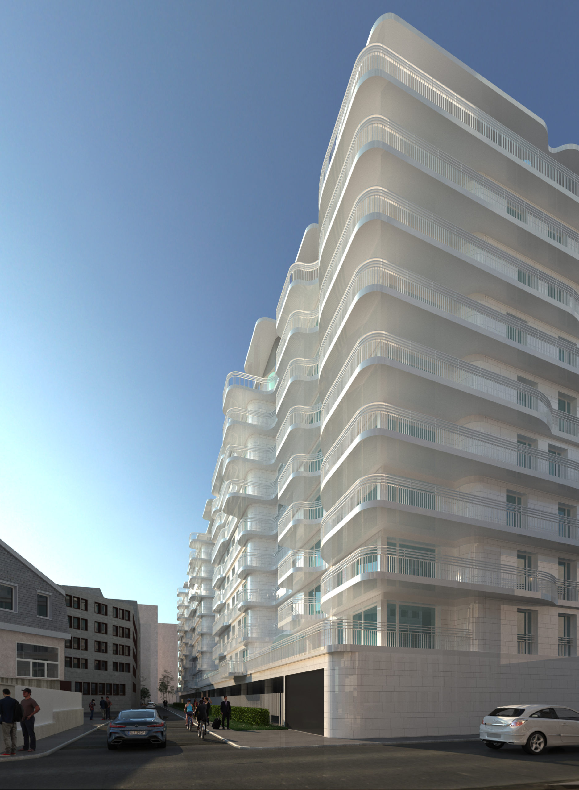 Balconies will be created on all levels. On the top floors, duplex flats will have terraces with wooden decking. The roofs will be flat and planted with vegetation.