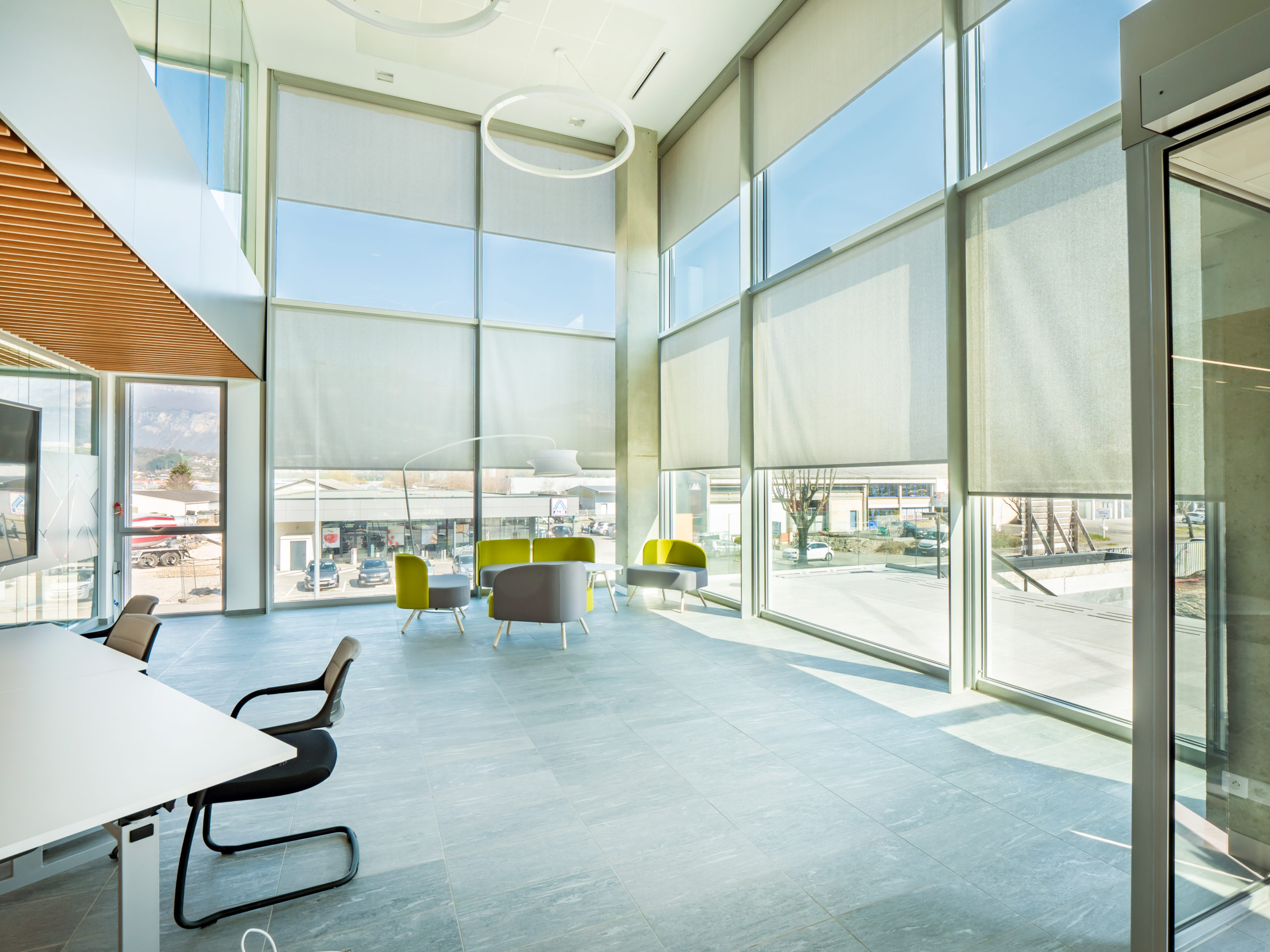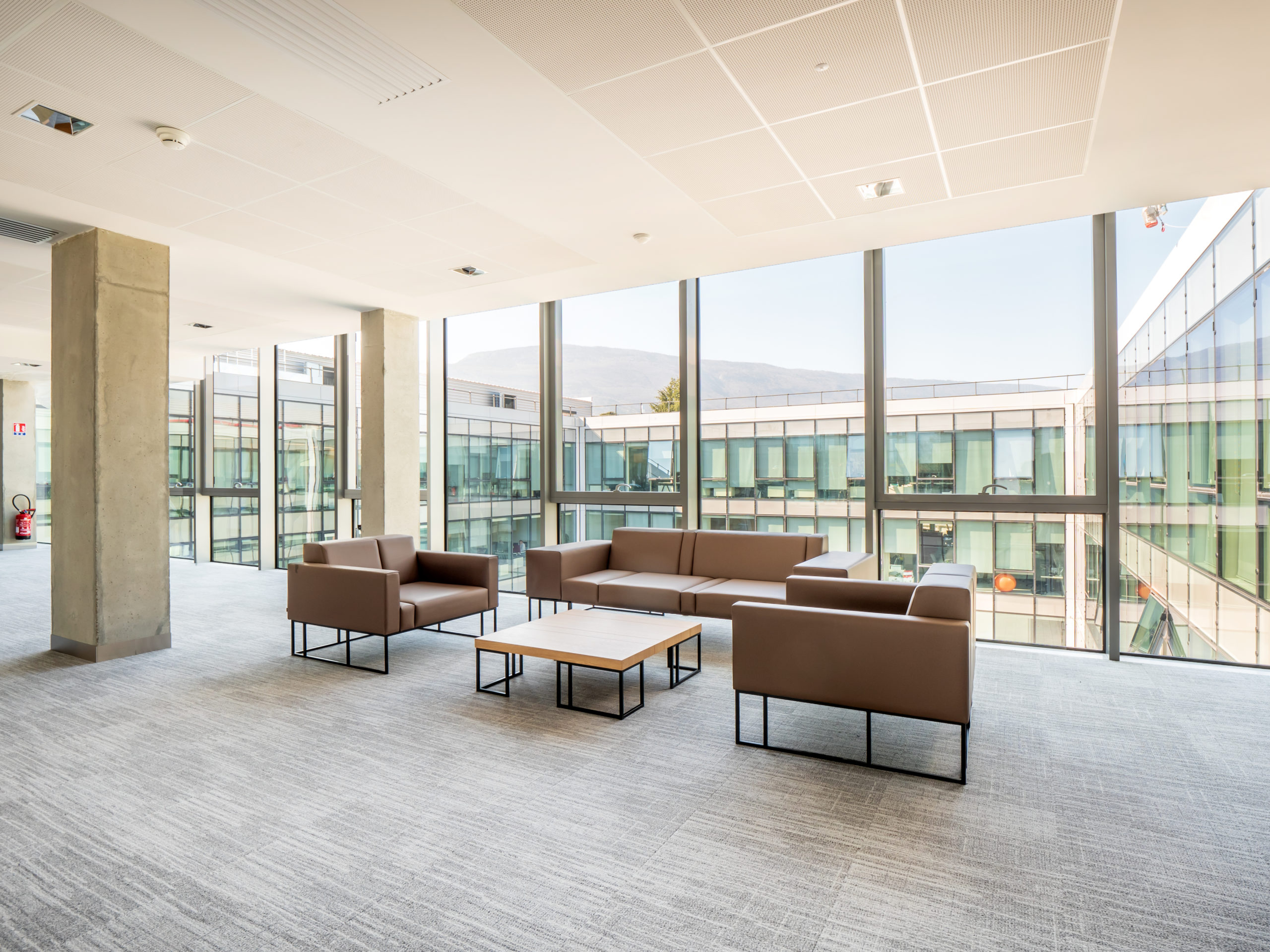 The offices, on levels R+1 and R+2, surround a central patio planted with trees, optimising circulation and natural light. The workspaces, laid out according to a 1.35 m façade module, offer flexible partitioning.The central garden takes advantage of the existing landscape and offers views of the mountains, incorporating islands of plants in random shapes.