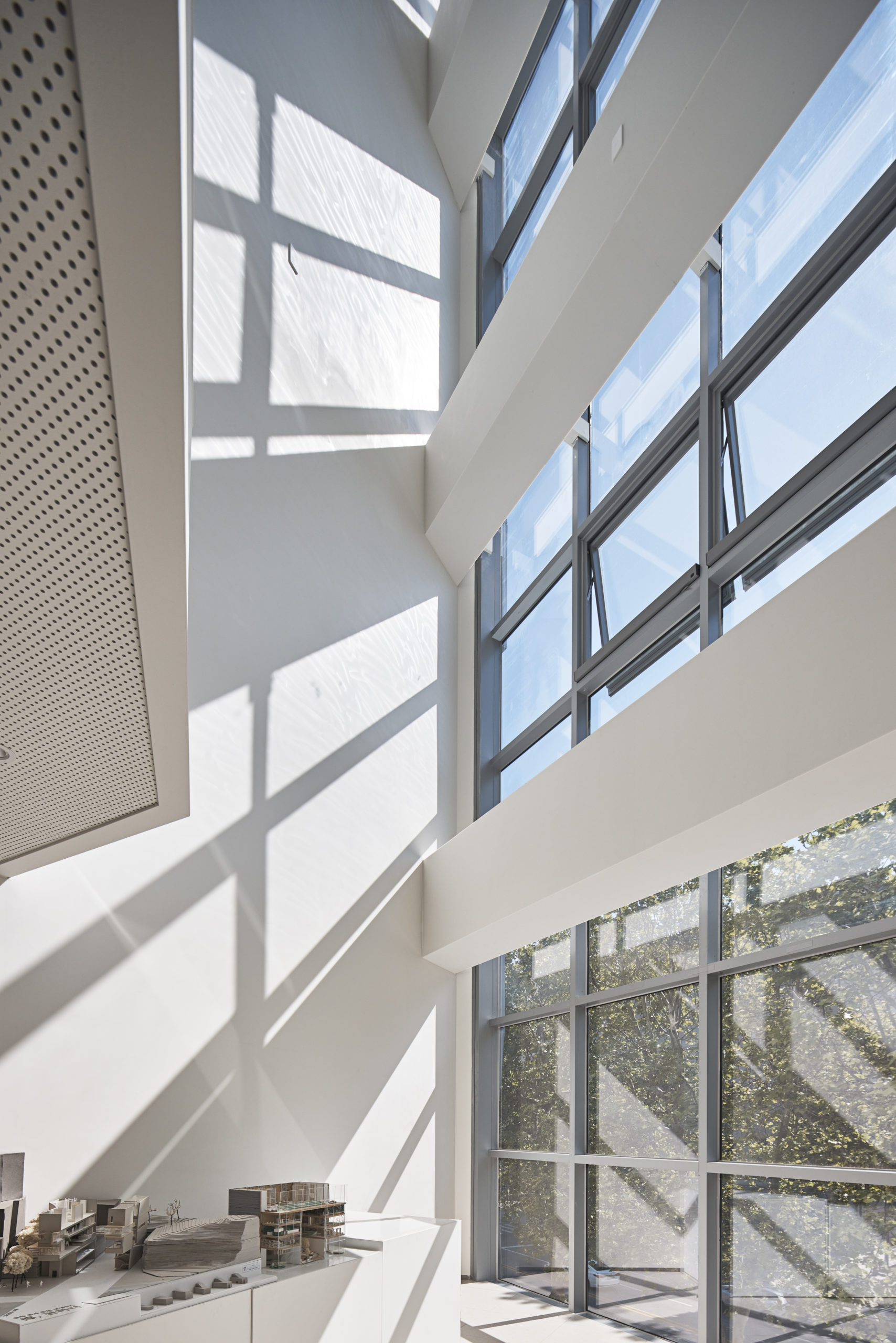 The interior spaces have been designed to be spacious and open. The large bay windows allow light to flood into the building, creating a calm and serene atmosphere, ideal for study.