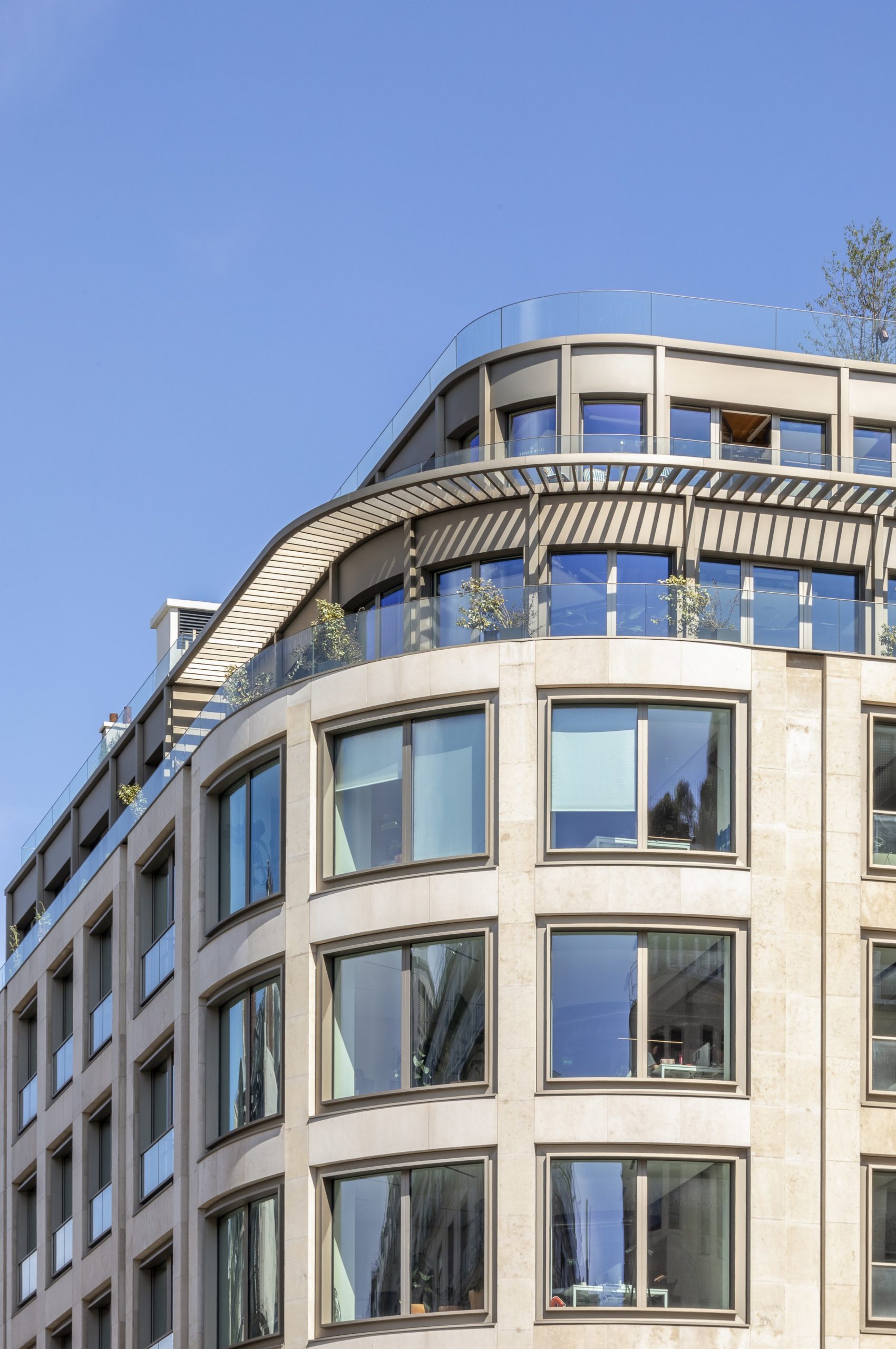 Afin de révéler au mieux le projet existant, un léger retrait est formé sur chaque ouvrant à tous les étages. Par ailleurs, les larges baies vitrées allègent le bâtiment le rendant plus poreux tout en s’intégrant dans le tissu urbain parisien. Les façades en rez-de-chaussée sont composées de baies vitrées et de porte d’accès vitrées toute hauteur. Les menuiseries sont en aluminium anodisé teinte bronze satiné. Les façades des étages R+1 au R+5 poursuivent le même principe avec de larges baies vitrées composées de deux ouvrants de confort toute hauteur. Au rez-de-chaussée, les espaces sont traités avec une pierre de ton clair et un faux plafond acoustique blanc.