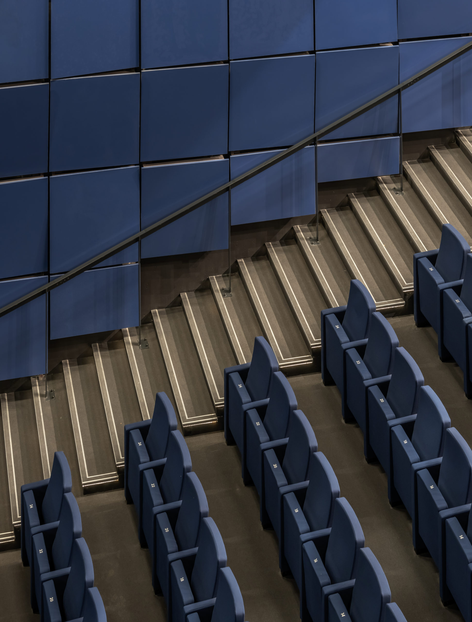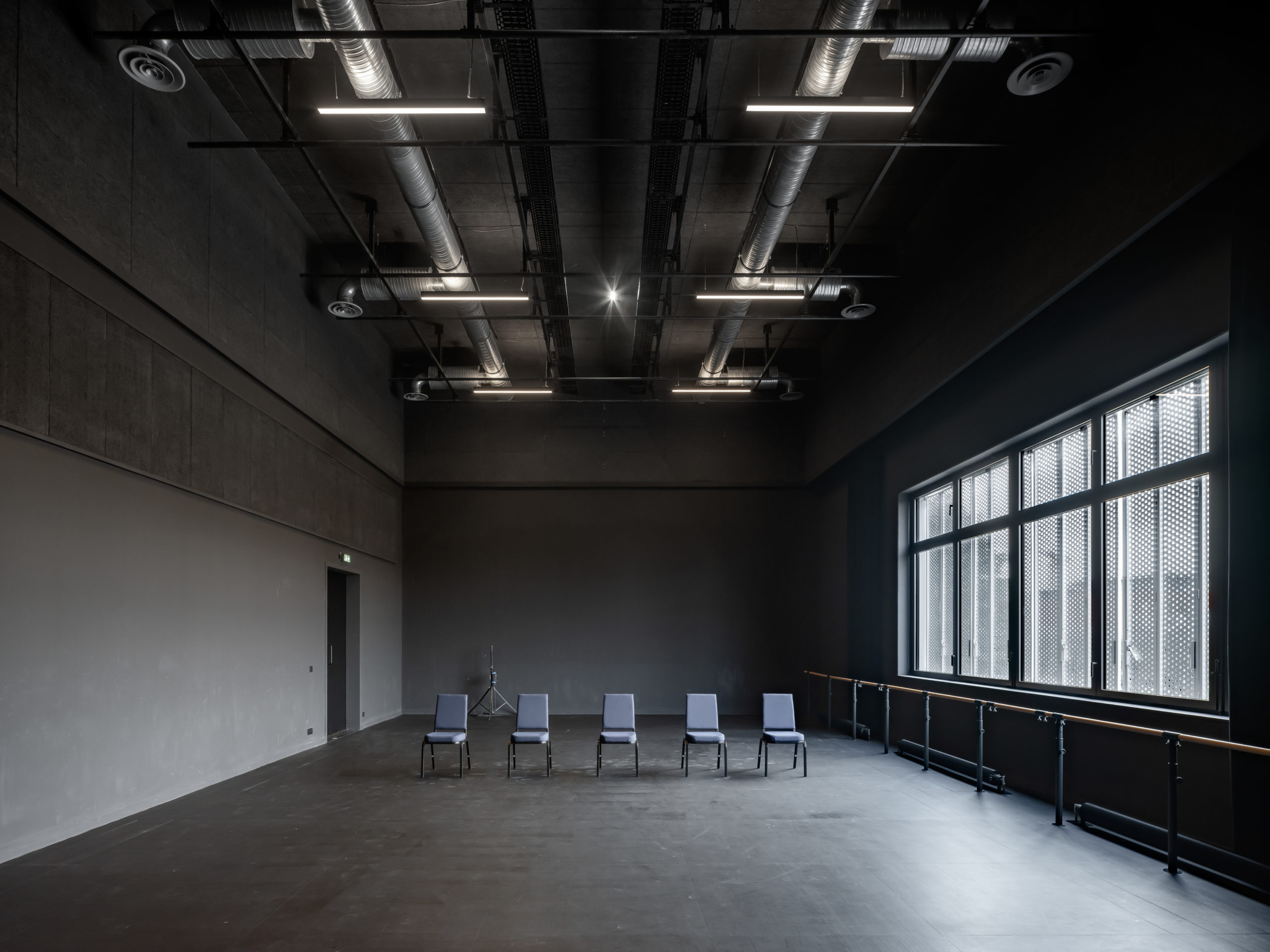 Pour conserver cette transparence, les salles de répétition sont prévues au premier étage et les bureaux au deuxième étage. La cage de scène, volume opaque de 18m de haut orientée vers la salle Jacques-Brel, est au cœur du projet. Le reste du programme lié au fonctionnement du théâtre est décomposé en volumes de dimensions plus réduites et s’organise naturellement autour de la cage de scène.