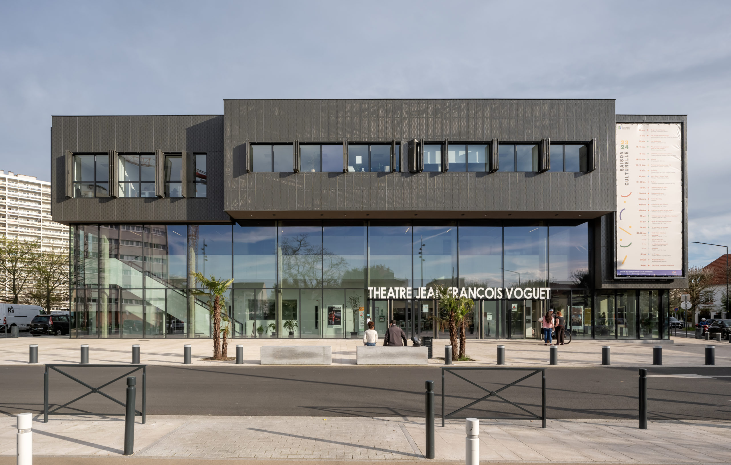 Avec une composition simple et élégante, l’utilisation de peu de matériaux différents en façades, le projet architectural met l’accent sur la fonctionnalité des espaces et les liens entre l’intérieur et l’extérieur du théâtre. Les façades des volumes principaux sont composées d’un voile en béton et d’un parement de cassettes métalliques perforées de couleur blanche et gris anthracite. Pour garder un lien visuel entre le théâtre et son quartier, les façades principales, orientées sur la place Marcel Paul et le boulevard, sont vitrées et permettent ainsi aux passants d’apercevoir les espaces d’accueil, le hall et le foyer. C’est une véritable invitation à entrer dans le théâtre.