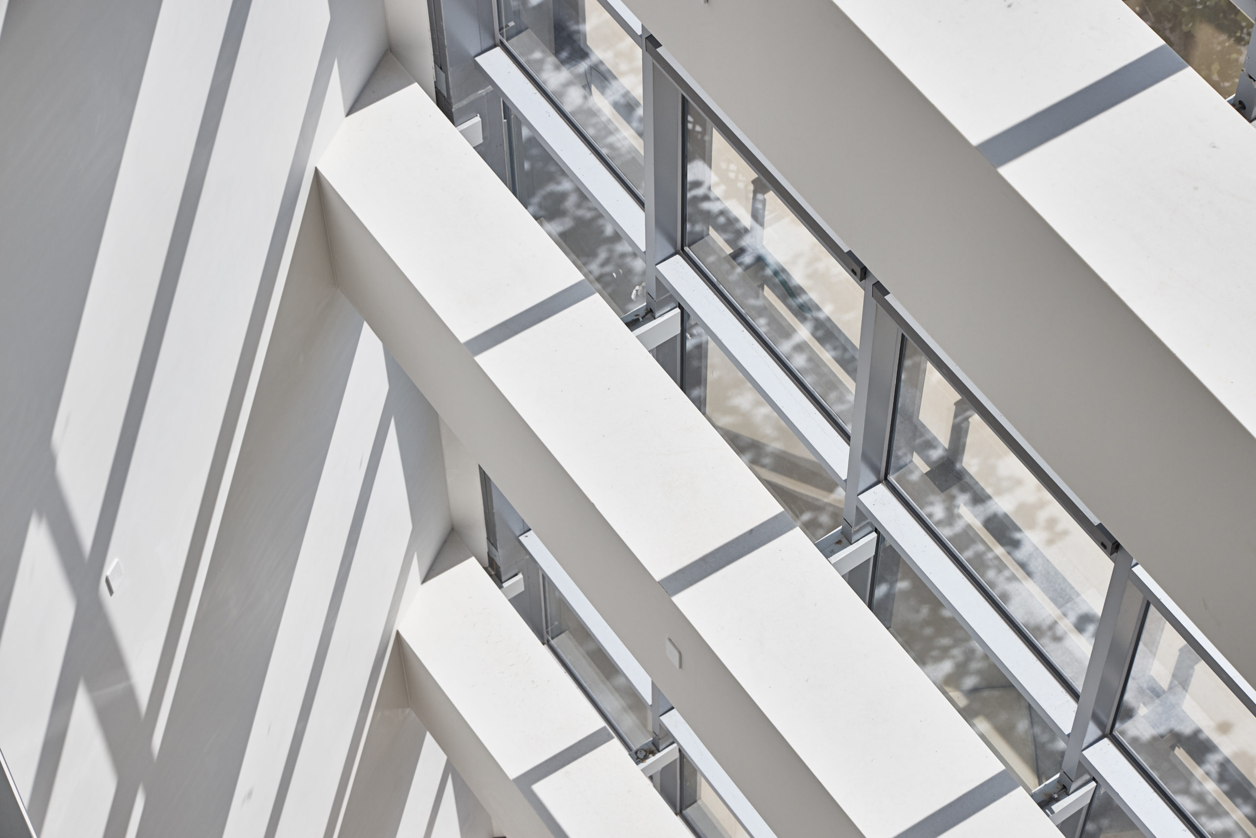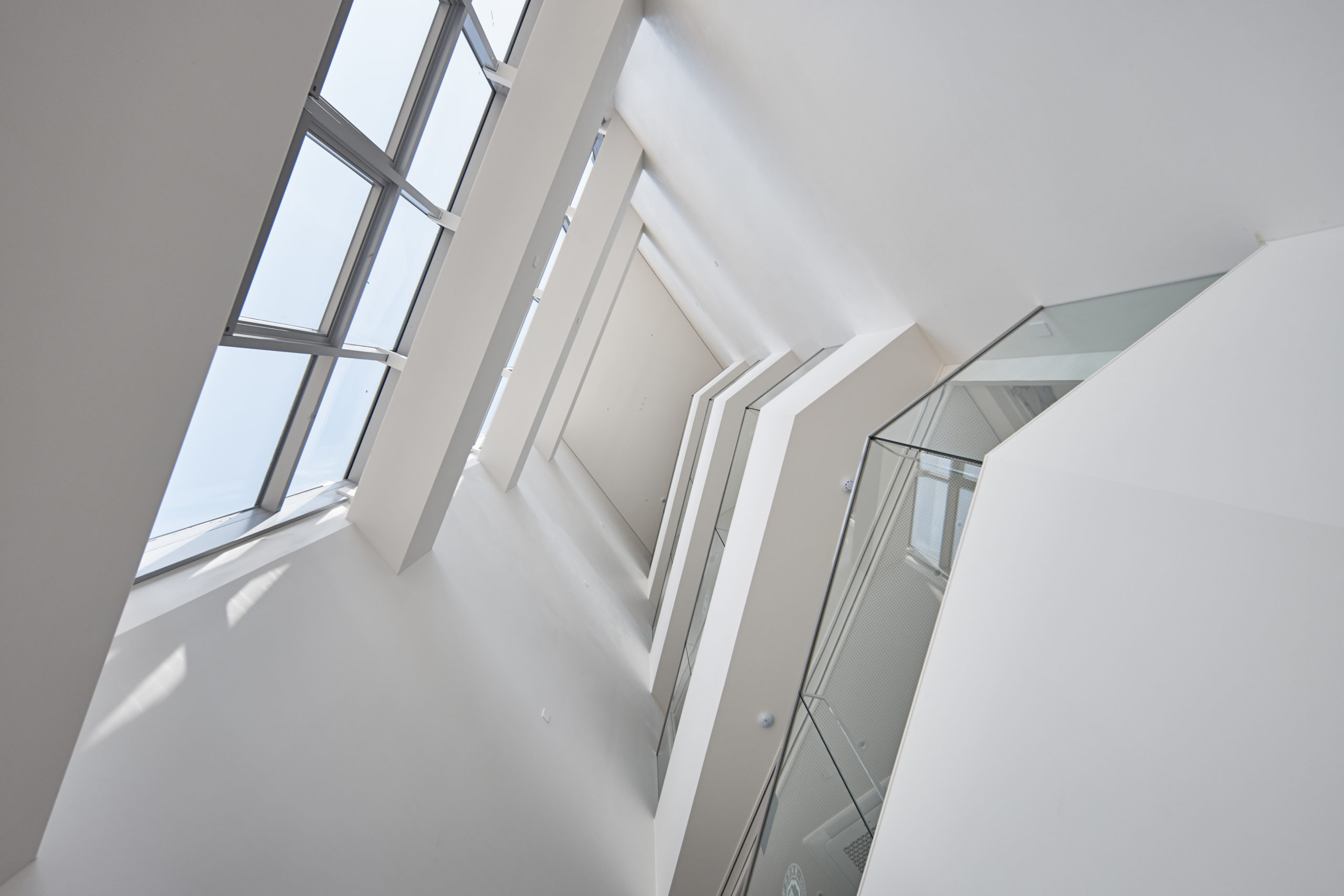 Les espaces intérieurs ont été pensés spacieux et ouverts. Les grandes baies vitrées laissent se propager la lumière au sein du bâtiment, pour créer une ambiance calme et sereine, appropriée à l’étude.