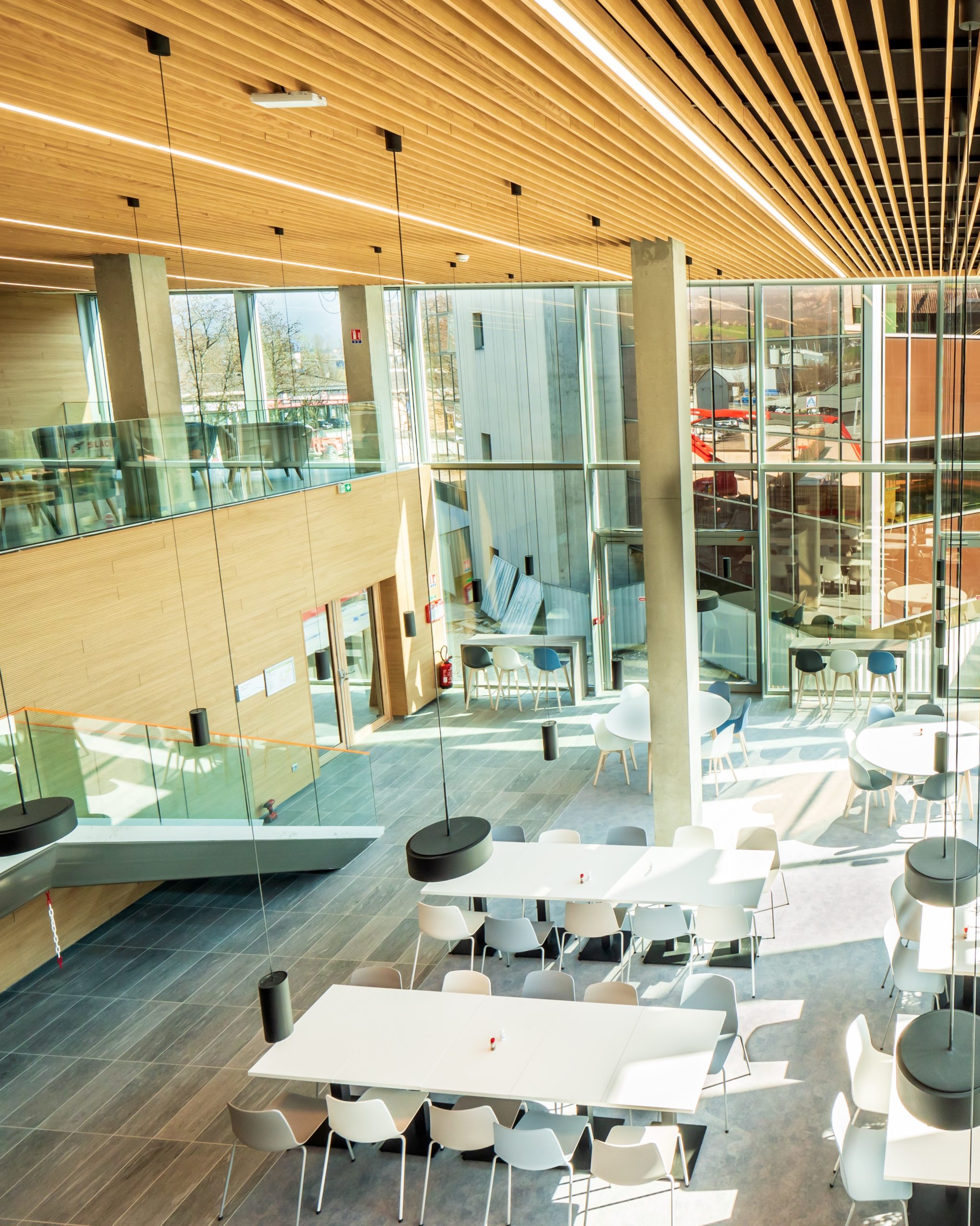 The offices, on levels R+1 and R+2, surround a central patio planted with trees, optimising circulation and natural light. The workspaces, laid out according to a 1.35 m façade module, offer flexible partitioning.The central garden takes advantage of the existing landscape and offers views of the mountains, incorporating islands of plants in random shapes.