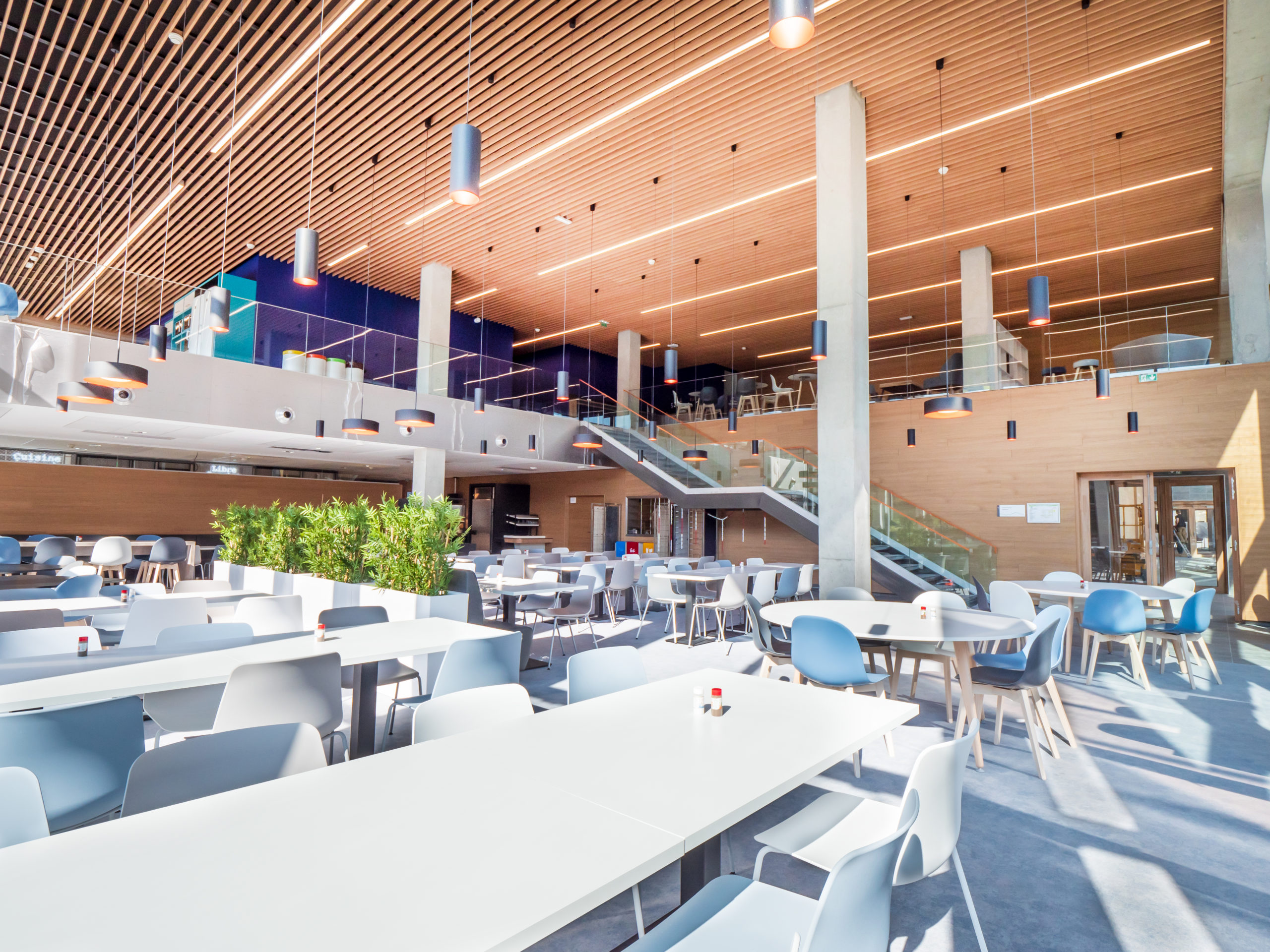 The design of the building is adapted to meet specific programming constraints, resulting in a compact “silo” type structure.This shape optimises space while meeting the requirements of the project. The building consists of three levels resting on a semi-buried car park. This configuration allows the ground floor to be raised, giving the façade spaces unobstructed views over the adjacent streets and surrounding low-rise buildings. This design seeks not only to maximise the efficient use of space but also to enhance the visual experience and interaction with the immediate urban environment. The architectural project includes an auditorium in continuity with the reception hall, benefiting from double height and large bay windows with sliding panels for flexible blackout. The adjacent catering area includes a dining room, a cafeteria and a lounge-club.