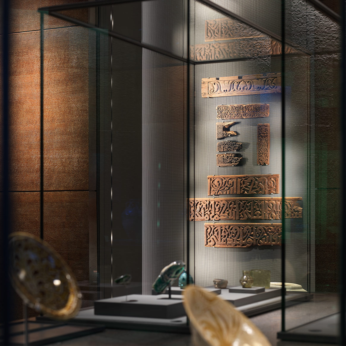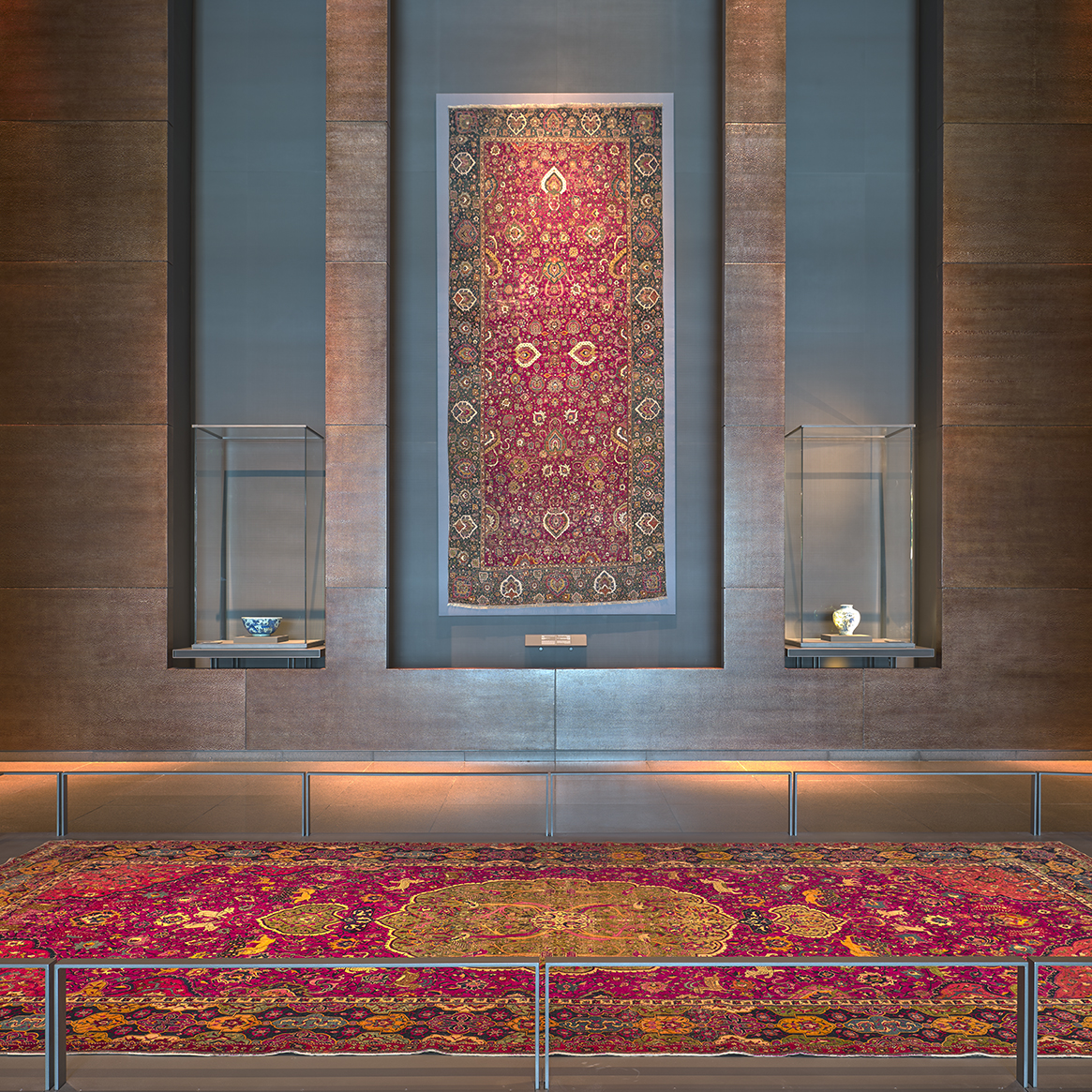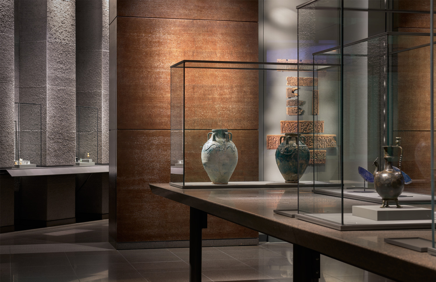 In the windowless exhibition rooms, devoid of natural light, the architect created a theatrical ambiance to enhance the beauty of gold-inlaid steel masks, silk garments from Samarkand, Mughal emeralds, and delicately calligraphed earthenware bowls.