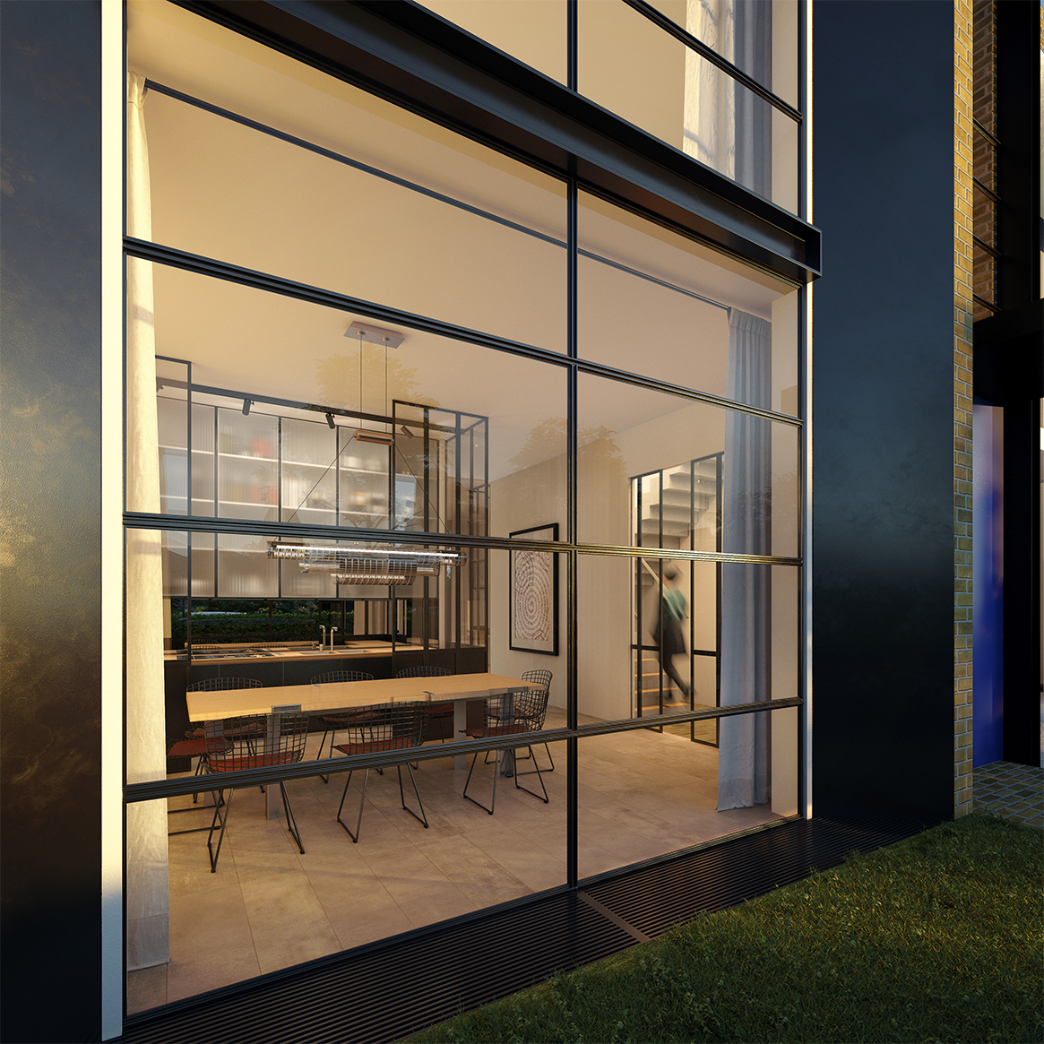 The façades of the housing units are set apart from one another due to their staggered positioning with varying setbacks. Vertical circulation cores are highlighted by glazed pavilions that create a rhythm throughout the development. The ceiling heights are generous, reaching approximately 3.50 meters on the ground floor and 2.80 meters on the upper floor. The choice of materials—brick, glass, and powder-coated metal cladding—contributes to the unity and coherence of the project.