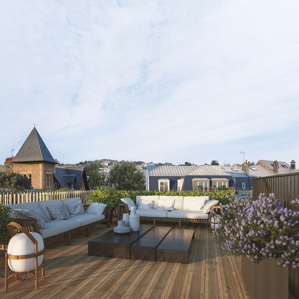 Designed to establish a strong continuity between interior and exterior spaces, the project offers dual-aspect houses with open views and landscaped private outdoor areas. The terraces, partially accessible via roof hatches, discreetly incorporate photovoltaic panels to better address contemporary environmental challenges.