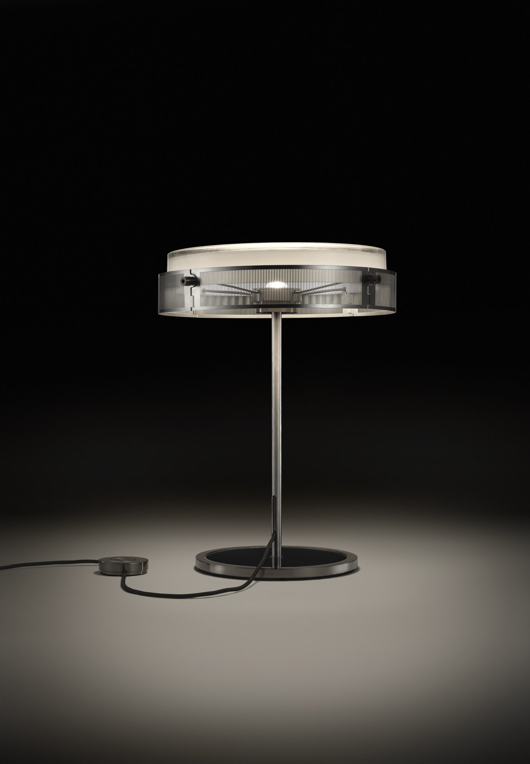 Les éléments extérieurs en acier photodécoupé enrichissent son design, tandis que la tige en acier inoxydable brossé, révélant un câble d’alimentation en tissu coloré, apporte une touche de couleur et de texture. La base en verre transparent, rehaussée par un anneau anodisé, et un variateur d’intensité en aluminium tourné, offrent une sophistication technique et une adaptabilité lumineuse.