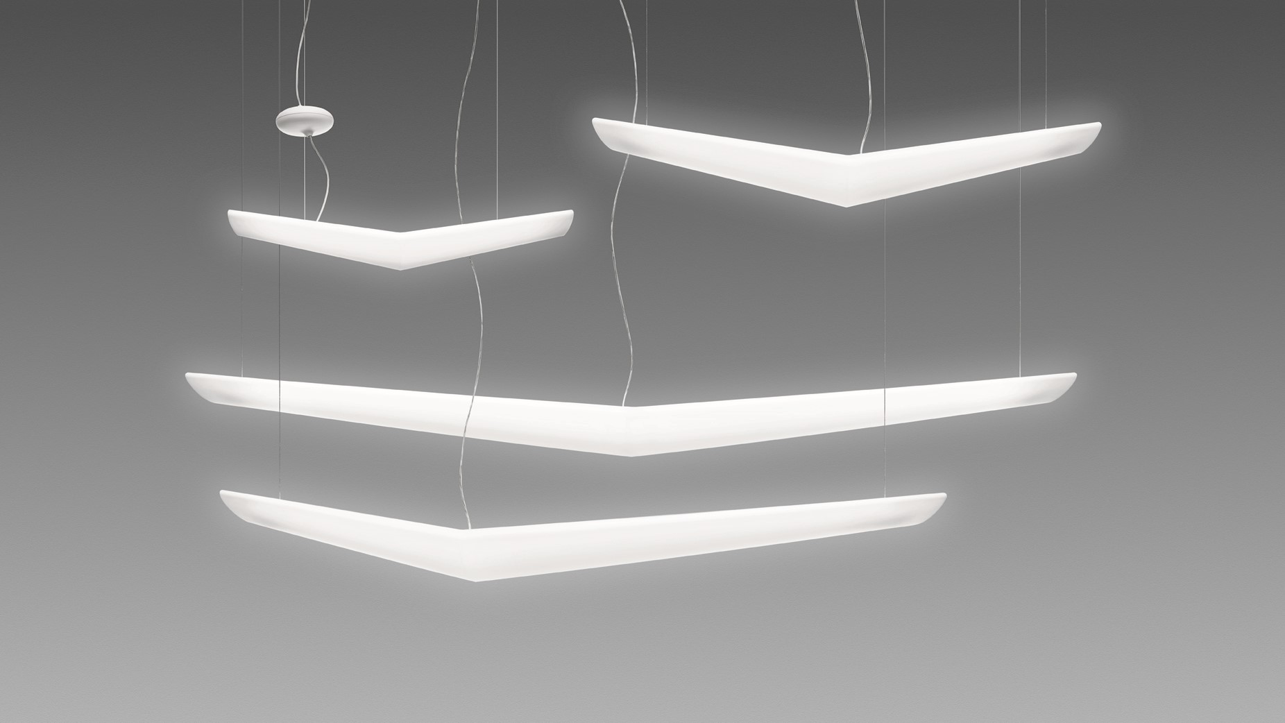 La géométrie stylisée de deux ailes symétriques ou asymétriques donne corps à un volume léger qui diffuse la lumière tout en douceur.