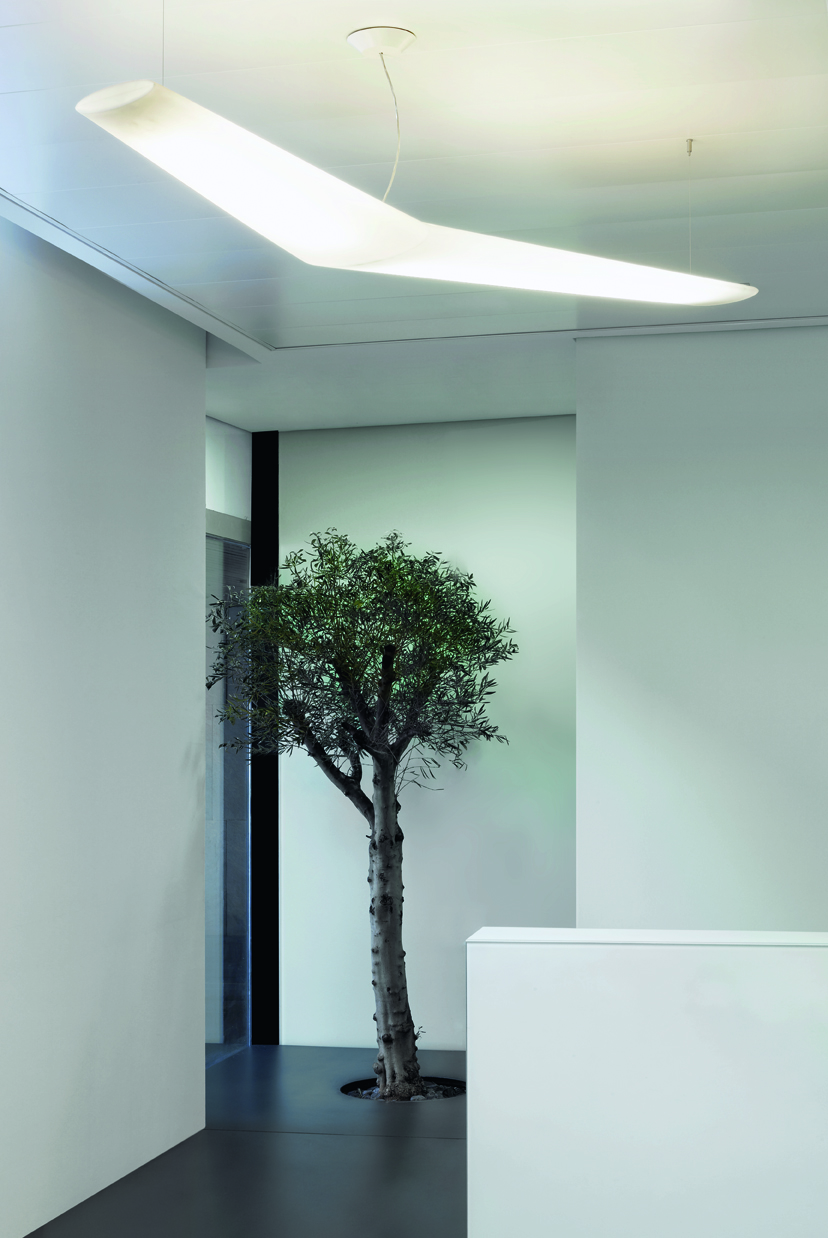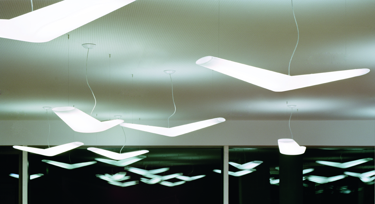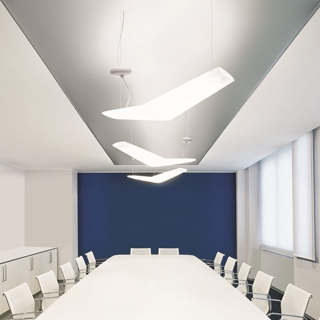 Suspension symétrique et asymétrique pour l’intérieur, lumière diffusante. Structure en aluminium extrudé, diffuseur en polypropylène moulé, câbles de suspension en acier, tubes fluorescents