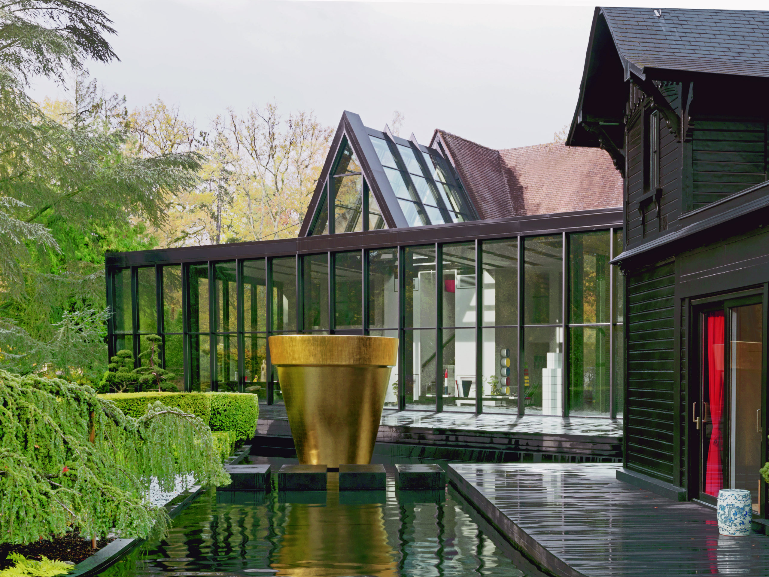 Un jeu de terrasses extérieures sur plus de 500 m2 compose un socle pur sur lequel se posent les éléments du projet : l’atelier, une sculpture monumentale du « pot », doré à l’or fin, un petit pavillon scandinave, relique centenaire d’une exposition universelle, racheté puis remonté sur le terrain il y a des années.