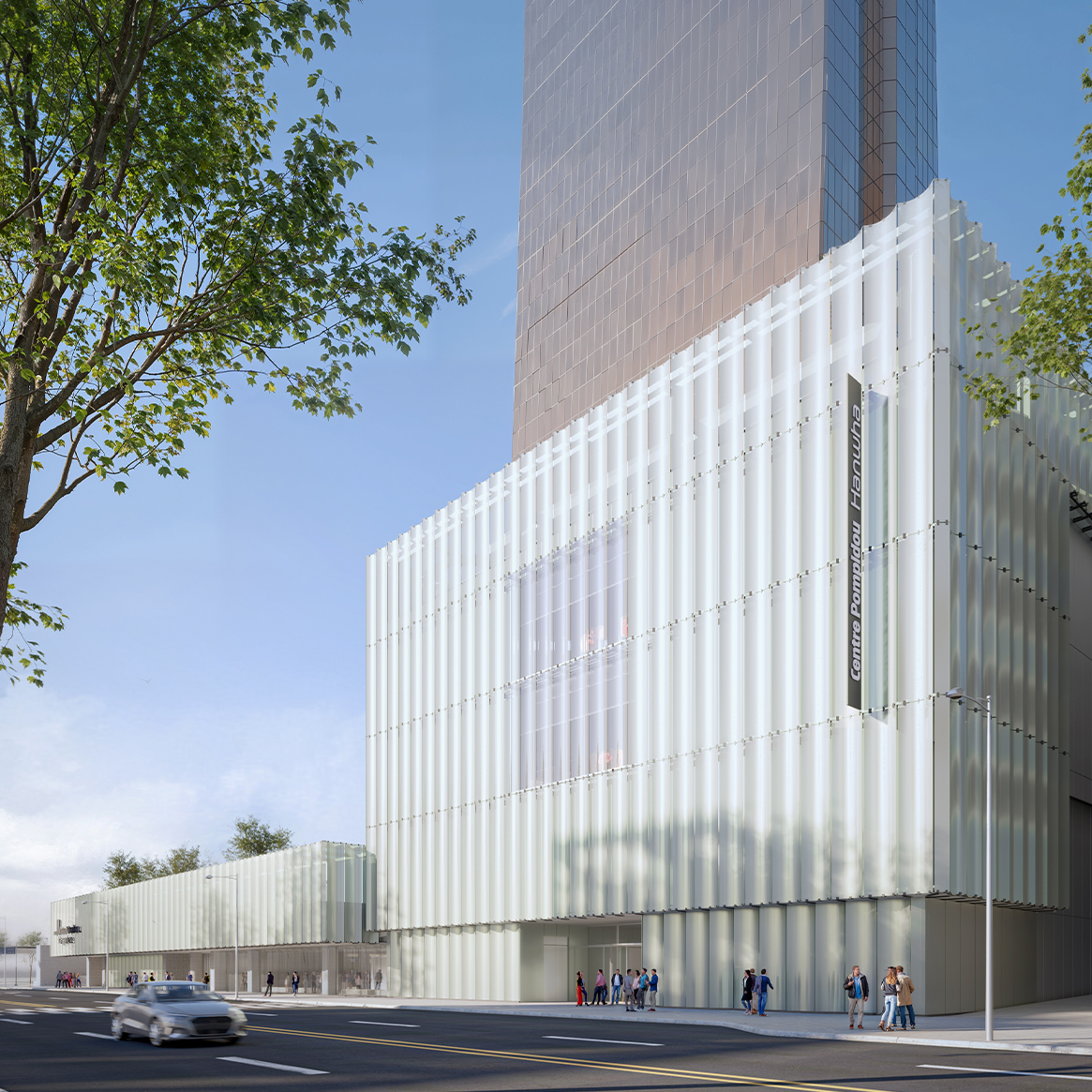 Contrastant avec la verticalité de la tour 63, la façade vitrée de 150 mètres de long du nouveau Centre Pompidou crée une connexion urbaine avec le quartier de Yeouido : rétroéclairée, elle devient un signal lumineux horizontal et un repère culturel visible depuis le fleuve Han.