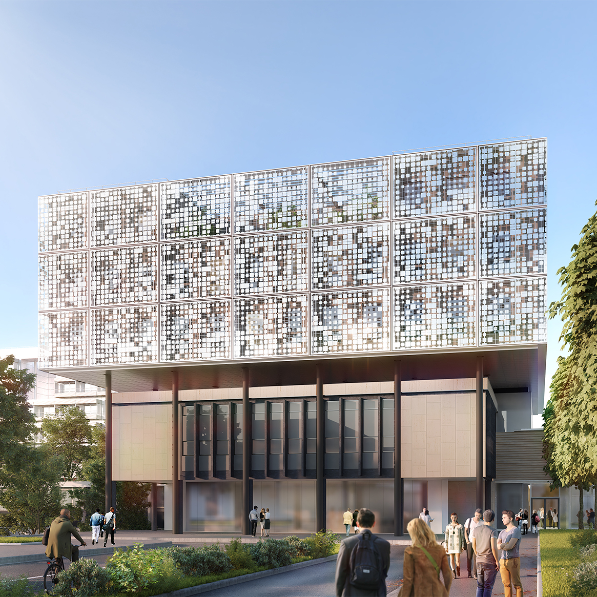 Pensé dans une écriture fine et légère, les lignes du bâtiment tendent à le faire flotter tandis que le maillage qui le constitue est une modénature à la fois élégante et précise. C’est un objet affuté qui se fait le reflet des recherches qu’il renferme.