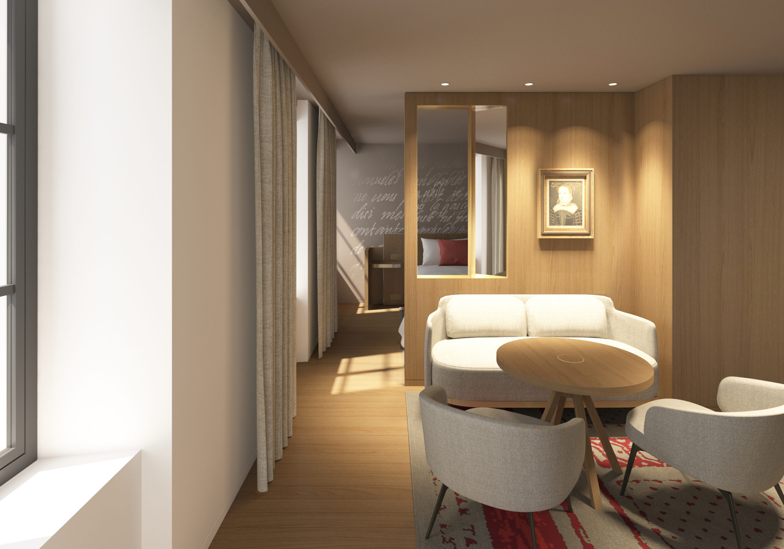 Pour l’architecture d’intérieur, des matériaux nobles et chauds ont été choisis, notamment du bois massif, de la pierre et du marbre. Les combinaisons restent sobres pour ne pas se perdre dans une trop grande diversité de matière, tout en mettant en valeur des éléments forts. Le travail des couleurs dans le nouveau bâtiment s’est axé autour de trois teintes de la gamme Aplat by Wilmotte : le Côme (1e étage), le Modène (2e étage) et le Taupe (3e étage). Dans l’ancien bâtiment, les couleurs choisies sont le Sel et le Taupe, provenant également de la gamme Aplat by Wilmotte. Ces teintes douces et chaleureuses permettent de mettre en valeur les éléments nobles des charpentes laissées apparentes, des poutres, des pierres murales.