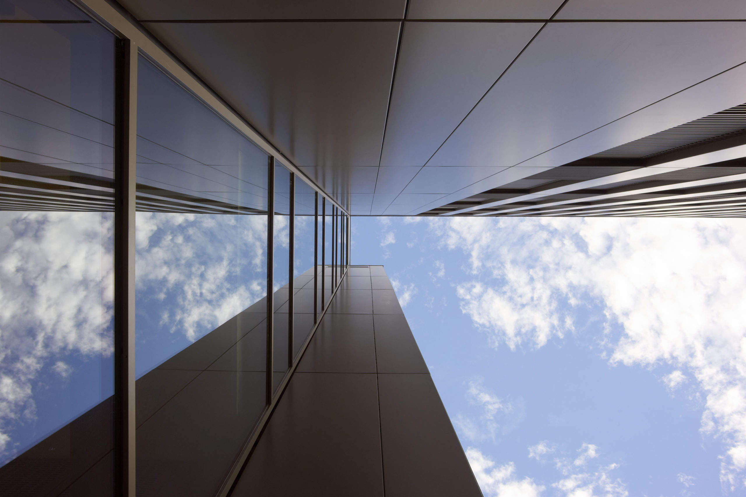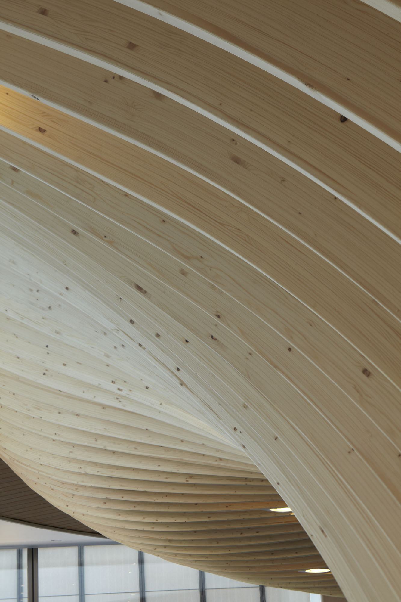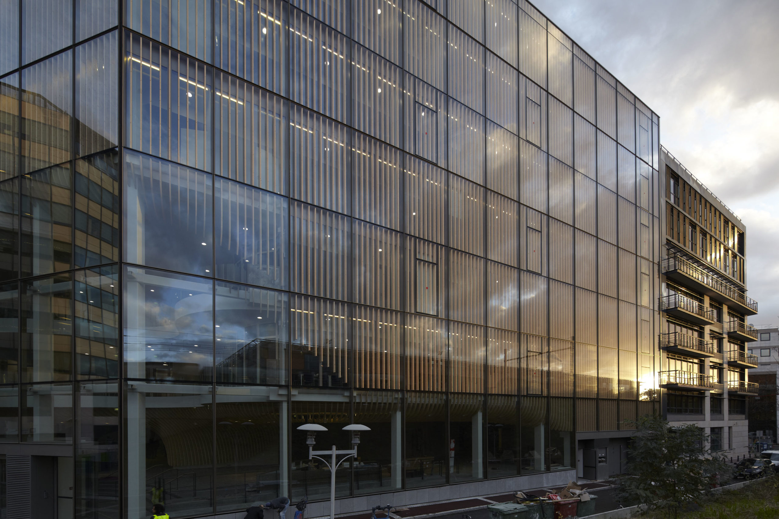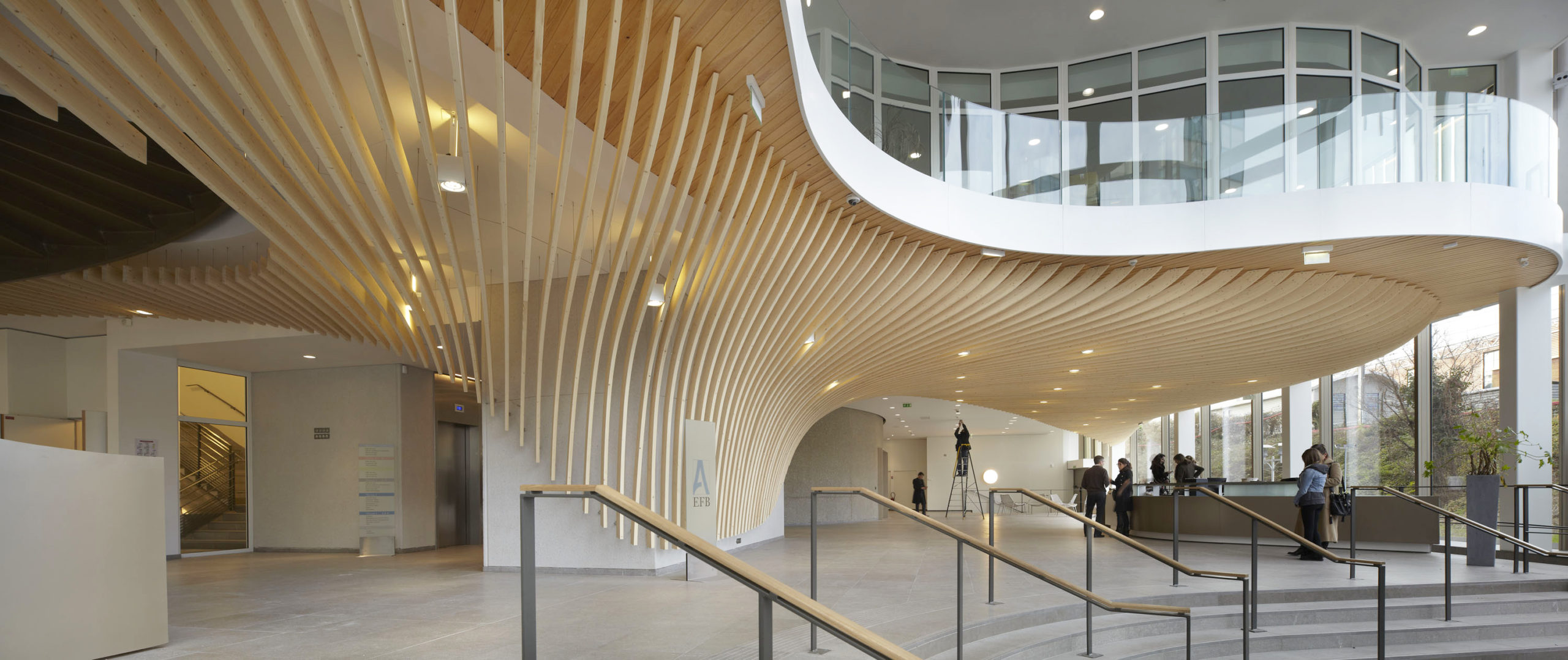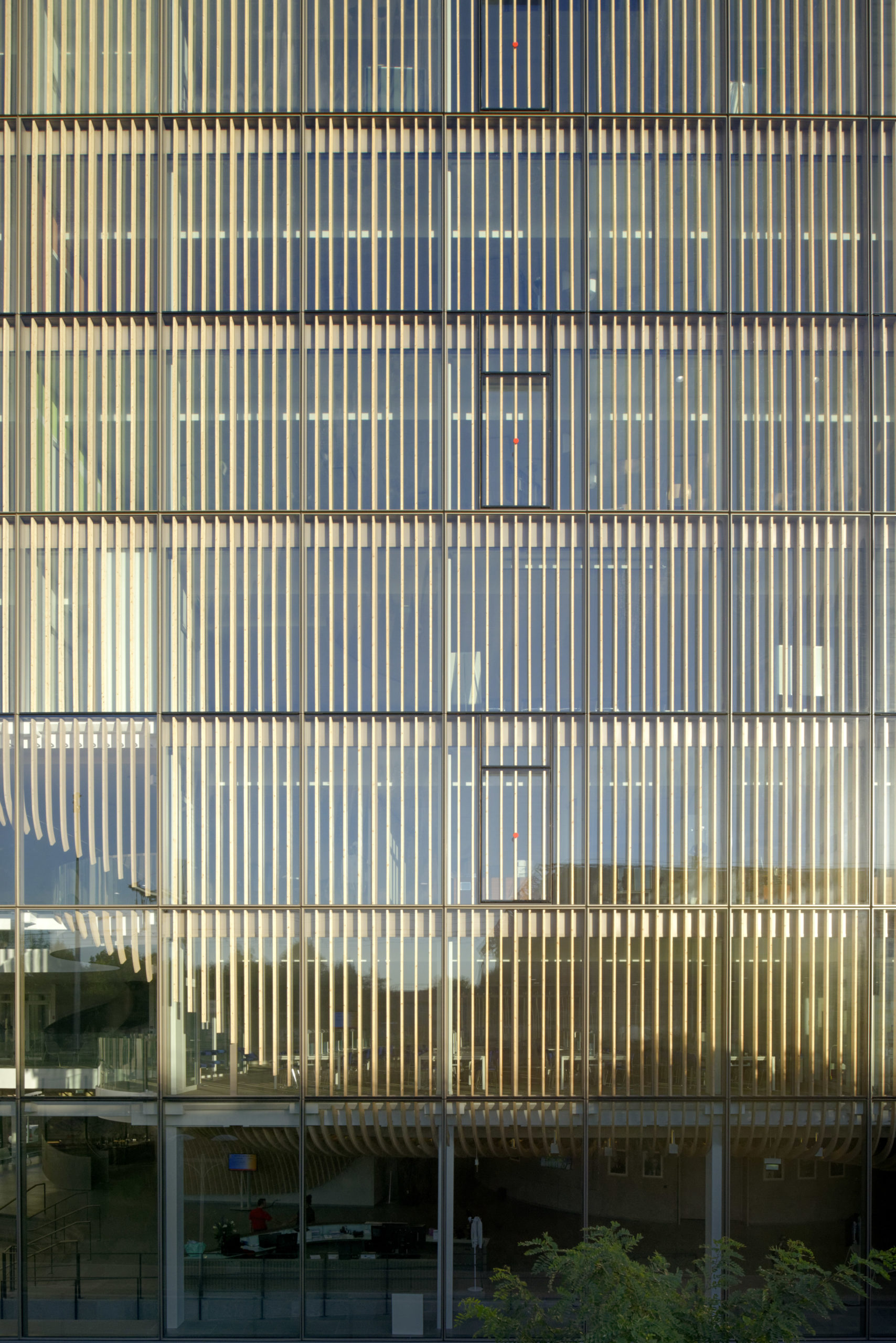 L’architecture du bâtiment met en exergue la simplicité volumétrique dictée par l’emprise foncière afin de mettre en valeur l’écriture des façades. Dans les étages, ces dernières intègrent des lames de bois derrière un simple vitrage afin d’amplifier leur visibilité par l’adoucissement des reflets et un jeu dynamique d’ombre et de lumière. Le « moment fort » du projet est le hall d’accueil sur trois niveaux, qui voit les lames de bois se détacher des façades pour s’incurver librement à l’intérieur du volume. Cette composition de bois intervient comme un voile ondulant au gré des espaces qu’il enveloppe.