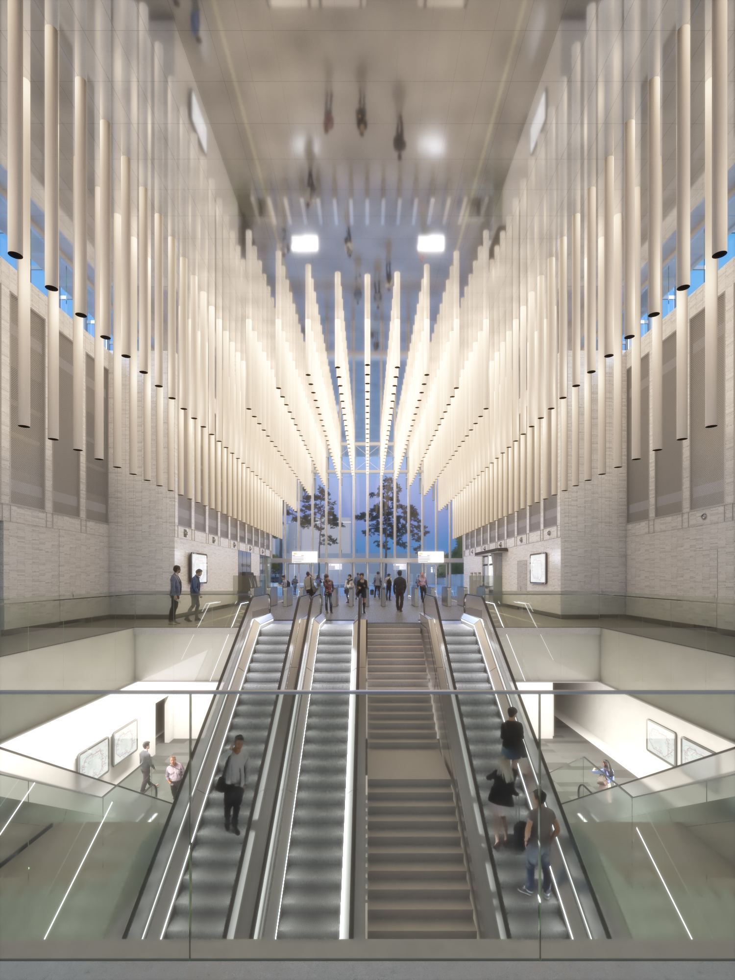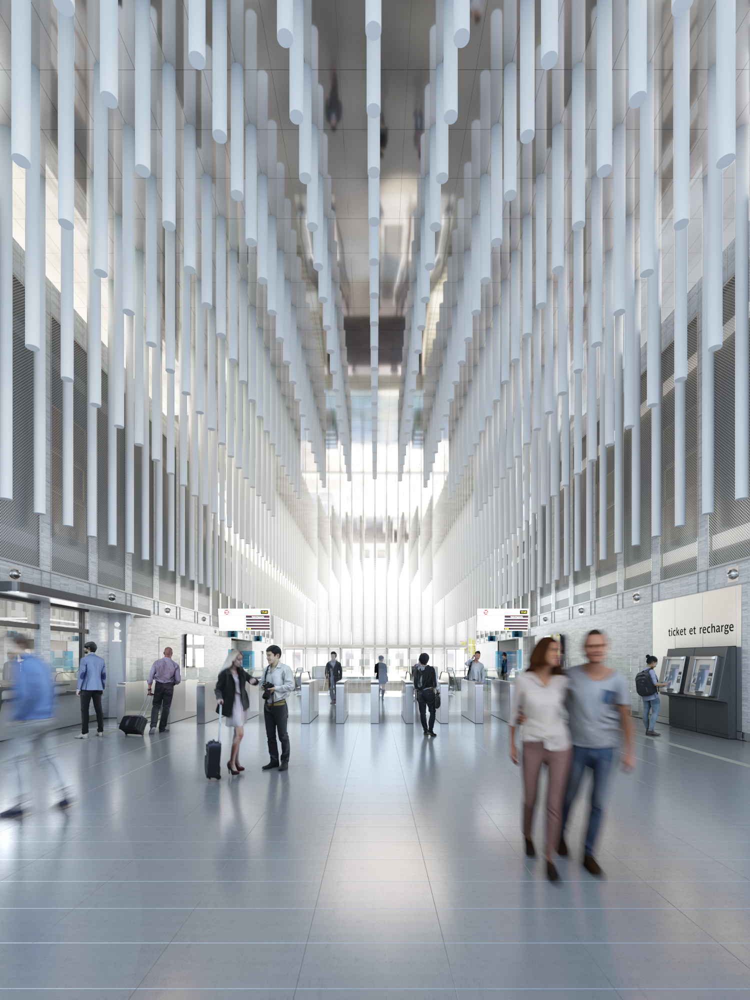Le design intérieur de la gare, notamment le hall des voyageurs, est le résultat d’un processus créatif visant à revisiter les formes classiques associées au métro parisien. En opérant une soustraction de ces formes à la structure globale, le projet parvient à créer un espace qui, tout en étant fonctionnel et accueillant, incarne également une nouvelle interprétation de l’esthétique des transports publics.