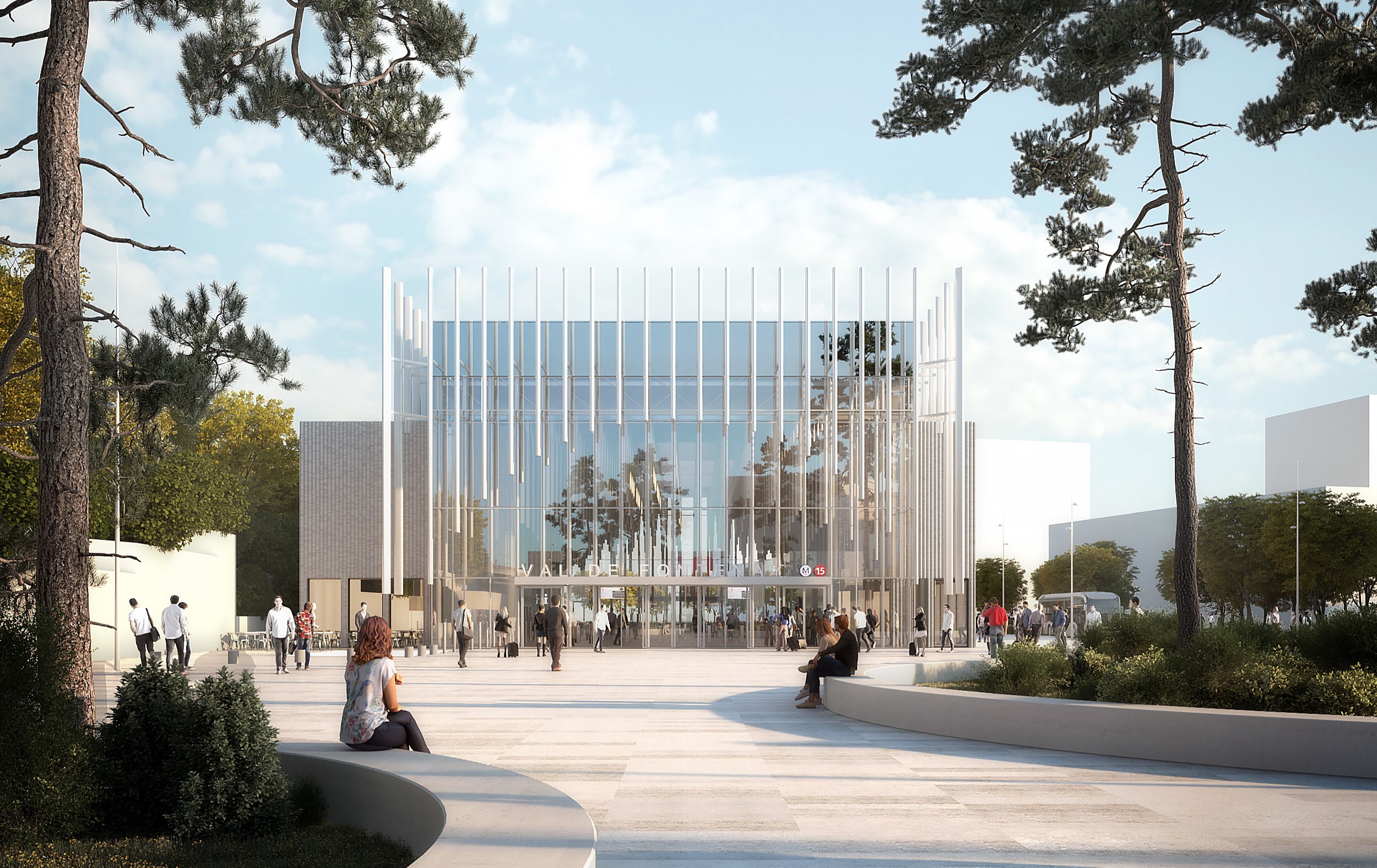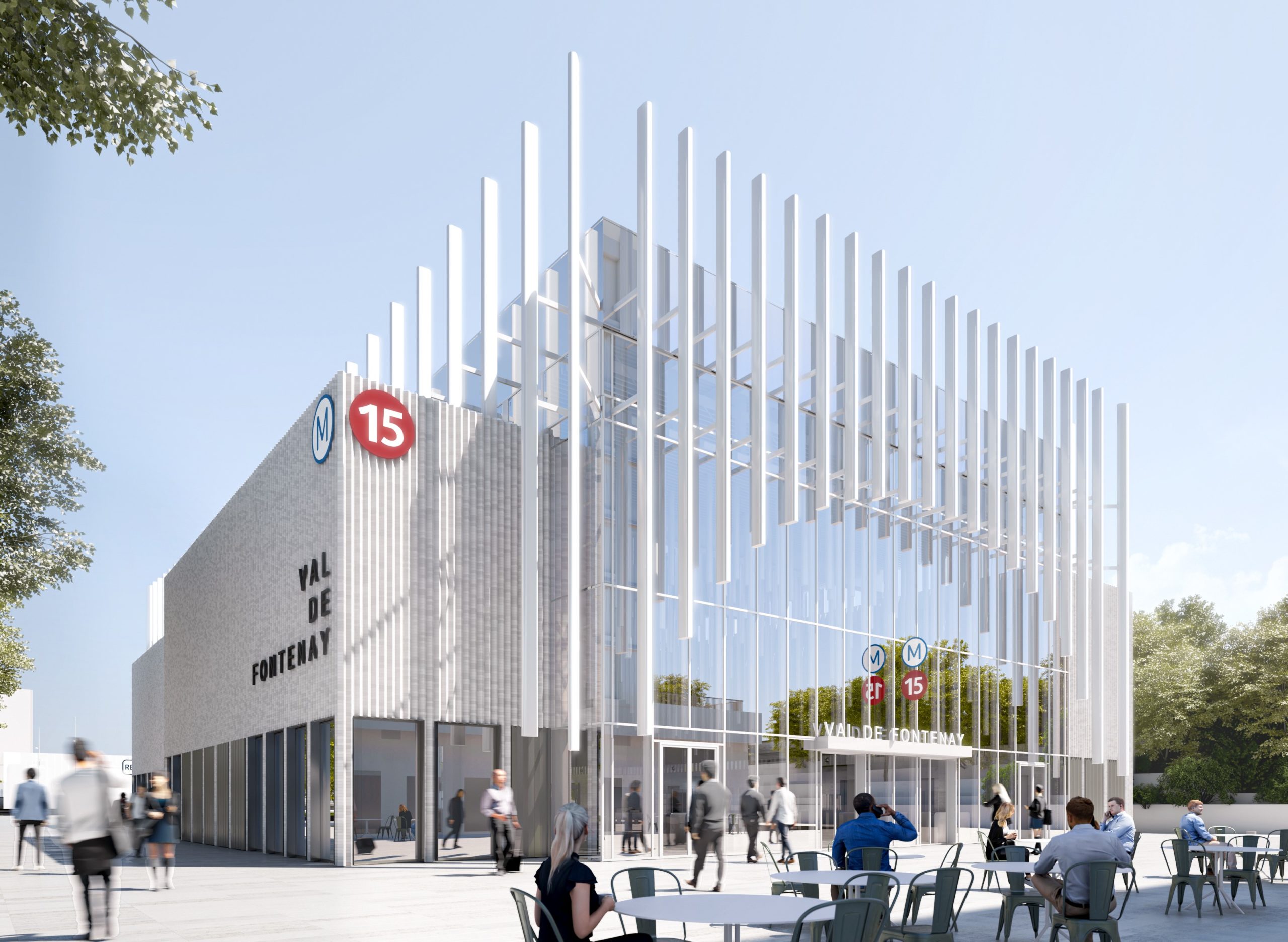 Située stratégiquement dans une zone d’activité logistique significative au nord-est de la station RER de Val-de-Fontenay, la gare est prévue pour devenir un pivot de mobilité et d’échange dans un secteur jusqu’alors contraint par des obstacles urbains majeurs tels que l’autoroute A86 et les lignes ferroviaires des RER A et E. La gare est conçue pour s’intégrer efficacement dans le tissu urbain existant, sans pour autant introduire une nouvelle séparation. À travers sa volumétrie réfléchie, la gare cherche à établir une continuité visuelle et fonctionnelle, en soulignant la volonté de rapprocher les espaces et les communautés. Cette structure, placée au cœur d’un espace ouvert, est destinée à devenir un point de repère significatif, facilitant l’orientation et renforçant le lien entre la gare et le quartier qu’elle dessert. Une vision incarnée par une esthétique lumineuse et douce, obtenue par l’assemblage répété d’éléments verticaux.