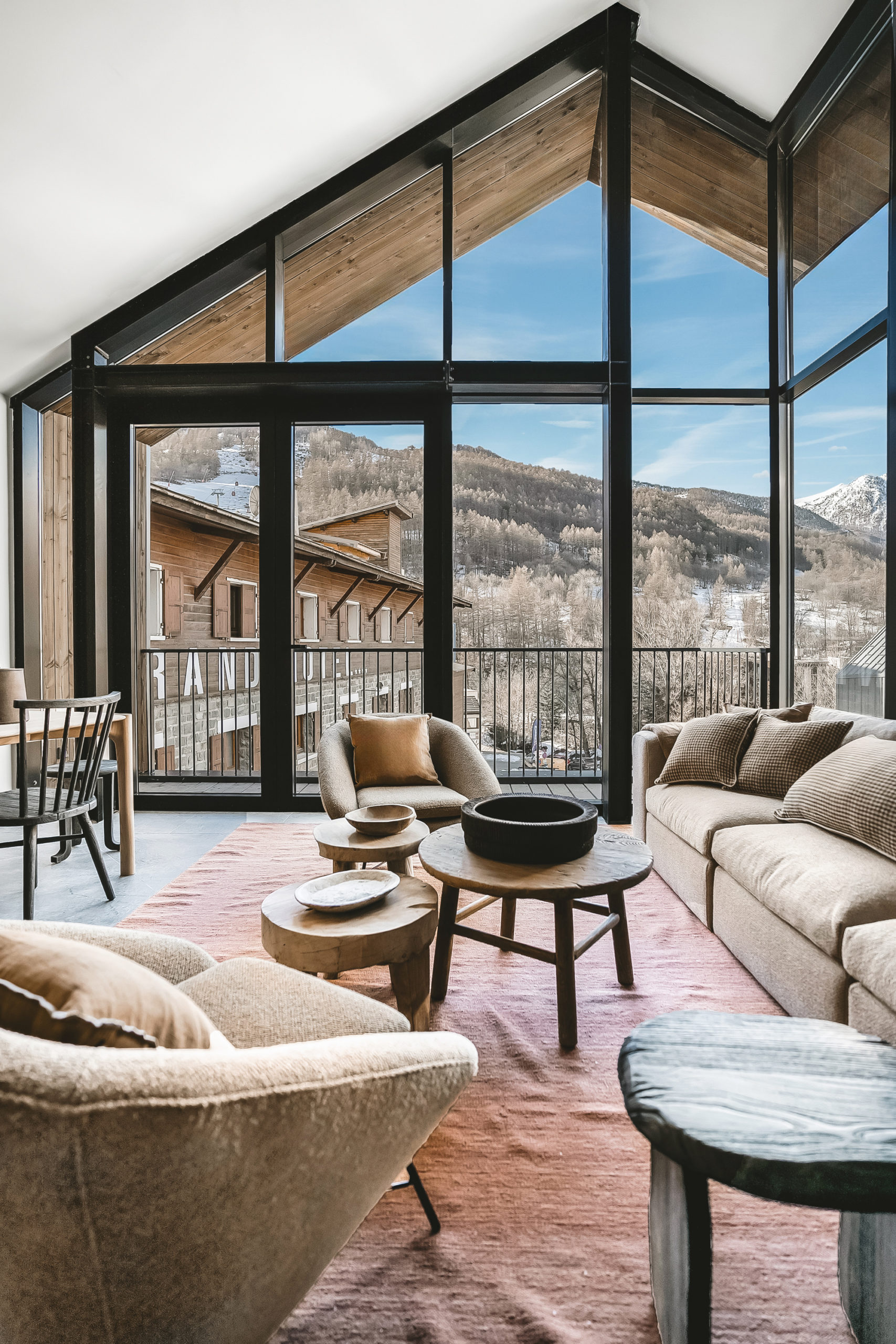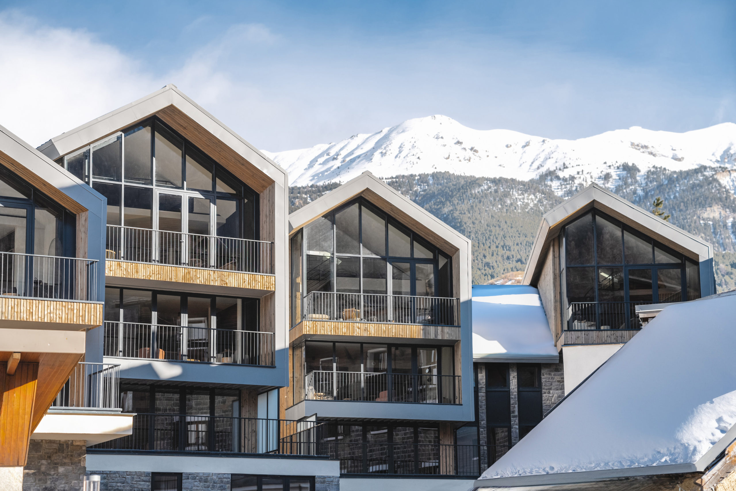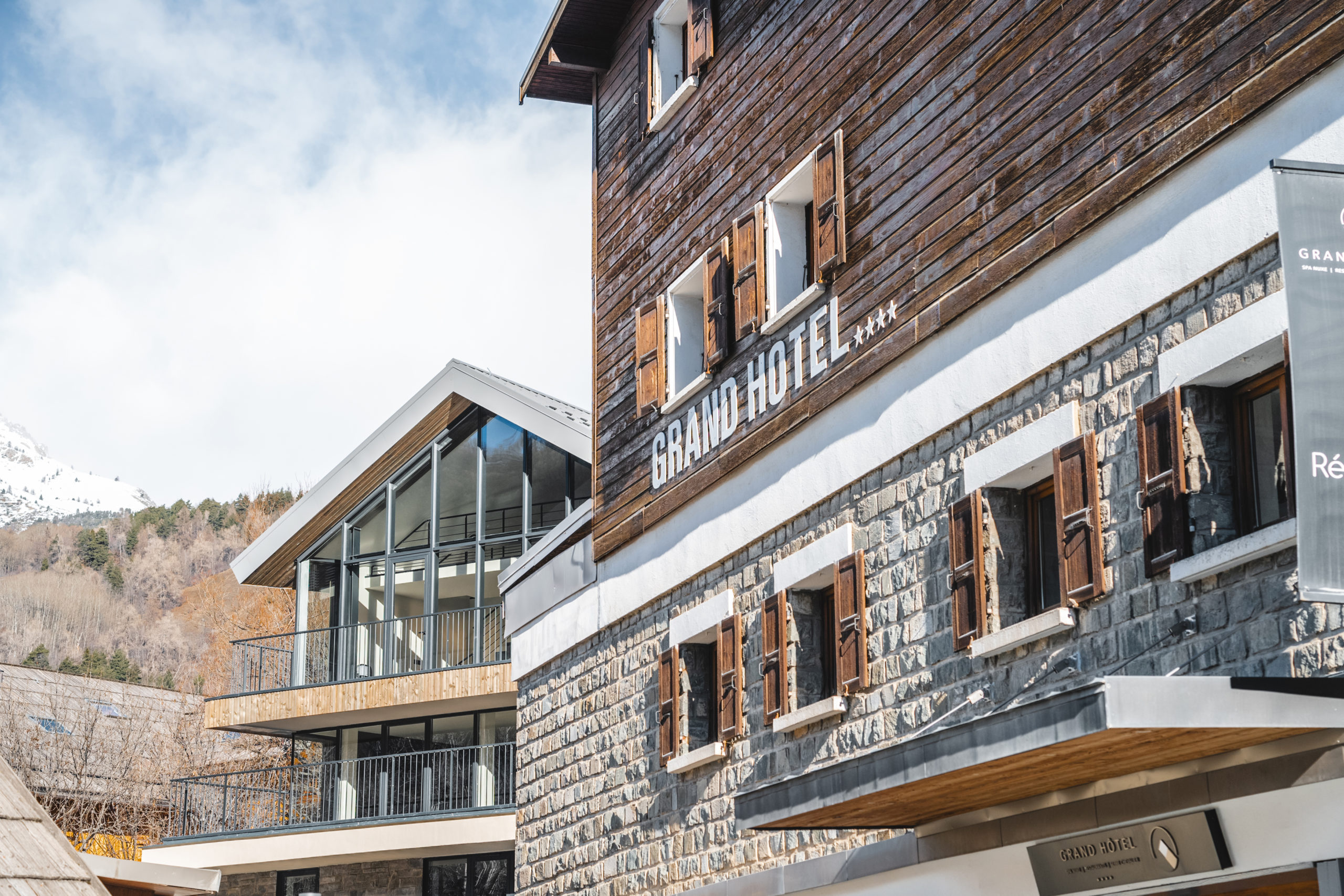 Bien intégrée dans la Vallée de la Guisane, l’architecture locale du Grand Hôtel est inspirée des chalets de montagne et emploie des matériaux de la région. L’orientation des quatre nouveaux chalets a été pensée pour offrir une vue imprenable sur la montagne. Leurs façades combinent bardage bois, grandes baies vitrées et terrasses en bois pour certains, revêtement en pierre et petites baies vitrées pour les autres. Les toitures en métal teinté ardoise et les socles en pierre renforcent l’harmonie avec le paysage.