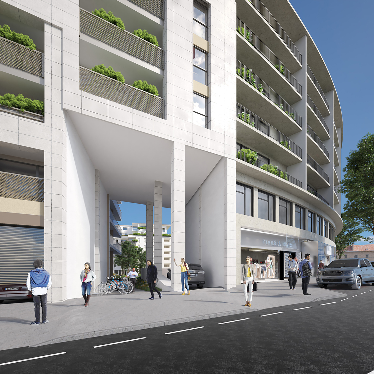 Sur la rue, les façades sont hiérarchisées, avec des loggias et, en premier plan, un parement en pierre naturelle. En harmonie avec cette dernière, les joues verticales, les plafonds et les fonds des loggias sont en enduit de teinte claire. Les éléments de serrurerie, les tôles et les menuiseries sont en finition peinture thermolaquée teinte sombre. Côté jardin, les façades lumineuses sont traitées en enduit clair, avec des balcons filants peints en sous-face.