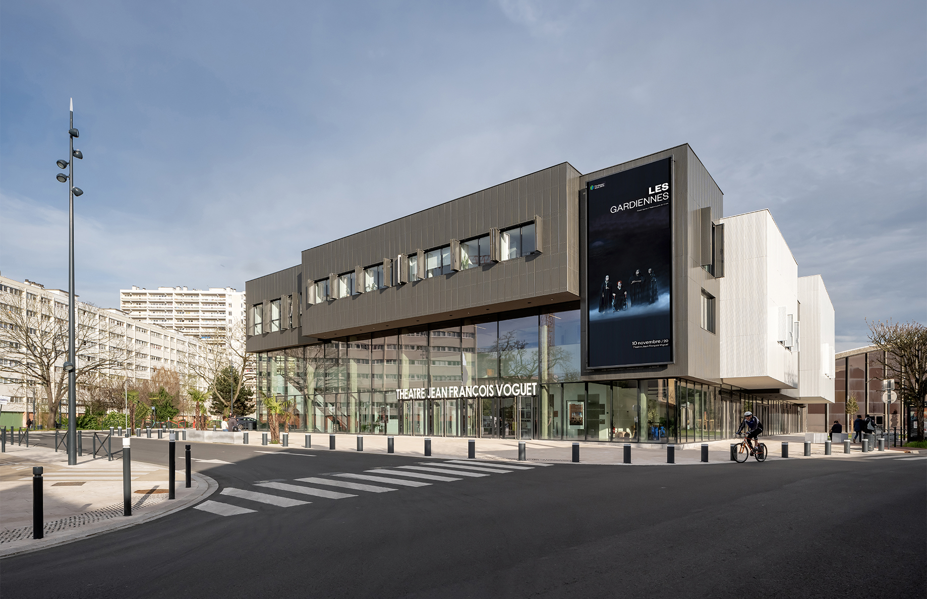 Avec une composition simple et élégante, l’utilisation de peu de matériaux différents en façades, le projet architectural met l’accent sur la fonctionnalité des espaces et les liens entre l’intérieur et l’extérieur du théâtre. Les façades des volumes principaux sont composées d’un voile en béton et d’un parement de cassettes métalliques perforées de couleur blanche et gris anthracite. Pour garder un lien visuel entre le théâtre et son quartier, les façades principales, orientées sur la place Marcel Paul et le boulevard, sont vitrées et permettent ainsi aux passants d’apercevoir les espaces d’accueil, le hall et le foyer. C’est une véritable invitation à entrer dans le théâtre.