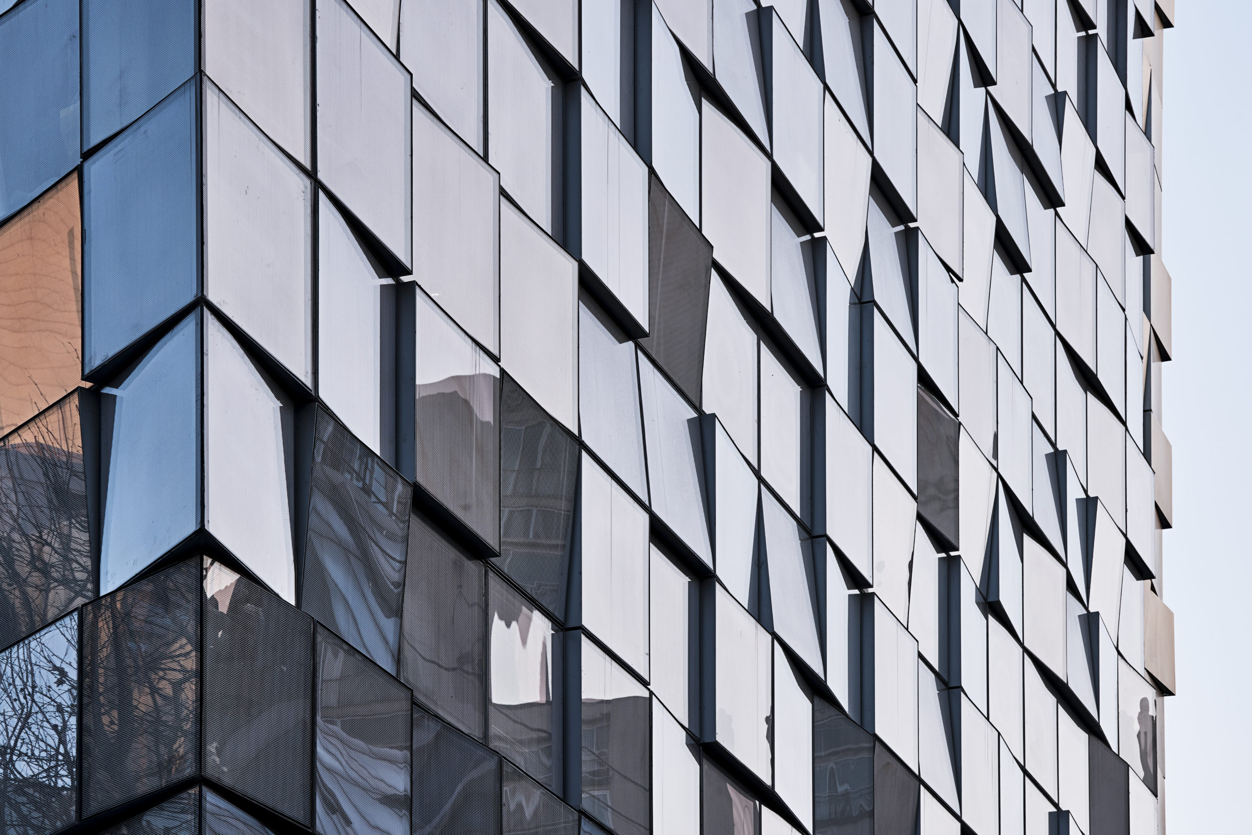 Les façades du bâtiment sont recouvertes de modules carrés d’un mètre vingt de côté reflétant la lumière. Ces modules ont tous un angle légèrement différent, laissant ainsi apparaître de subtiles aspérités et donnant un caractère fort au façades : une image de liberté au sein d’un cadre structuré.